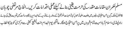 RAWALPINDI, May 28: The Muslim rulers should take practical steps to ensure the dignity of the Holy sites of Islam - Alhaj Murtaza Chohaan |