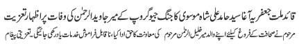 ISLAMABAD, April 1: The Quaid e Millat e Jafariya Agha Syed Hamid Ali Shah Moosavi pays his condolences on the sad demise of Mir Jawaid ur Rehman of the Jang Geo Group |