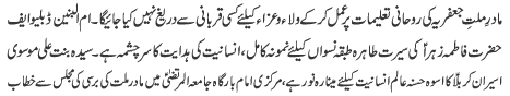 ISLAMABAD, April 2: The Youme Nosha e Karbala (AS) celebrated with great religious zeal and reverence, with that, Hafta e Walae Mohammad O Aale Mohammad (AS) concluded |