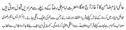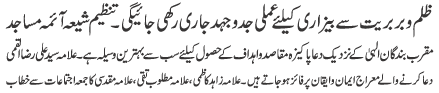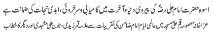 ISLAMABAD, July 1: Aalmi Ayyame Zamin (AS) begin today; in order to get freedom from hardships, it is paramount to follow Ahlebait (AS) |