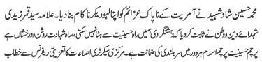 ISLAMABAD, July 8: Mohammad Hussain Shad Shaheed failed the heinous intentions of dictatorship by laying his life - Qamar Zaidi |