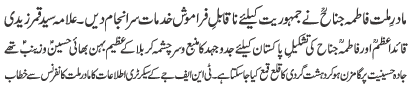 ISLAMABAD, July 10: Madre Millat Fatima Jinnah rendered great services for democracy - Qamar Zaidi |