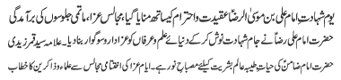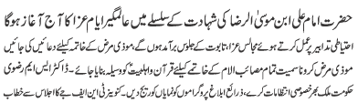 ISLAMABAD, July 15: The martyrdom anniversary of Imam Ali Bin Mousa Raza (AS) will be commemorated with great religious zeal and reverence |