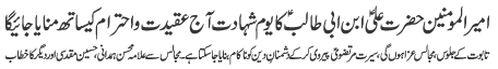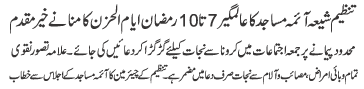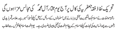 ISLAMABAD, May 19: On the call of the Tehreek Nafaz e Fiqh e Jafariya, Youmal Quda Hamaeyat Mazlomeen will be observed on Juma tal Wida |