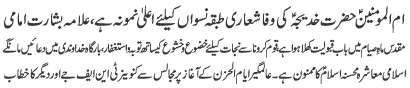 ISLAMABAD, May 2: The pious life of Ummal Momneen Hazrat Khadijatal Kubra (SA) is the best example for women folk - Basharat Imami |