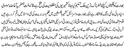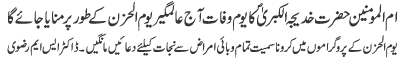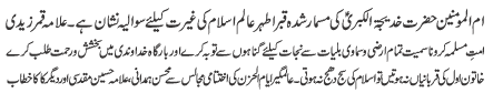 | RAWALPINDI, May 4: Youme Wafat of Ummal Momnieen Hazrat Khadijatal Kubra (SA) will be commemorated today | |||