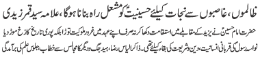 ISLAMABAD, October 21: Azadari, the peaceful protest of the oppressed the world over has shattered the foundations of oppression and barbarity - Basharat Imami |