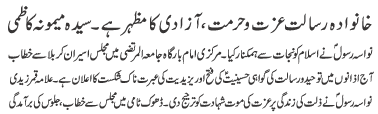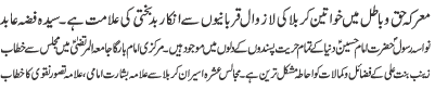| ISLAMABAD, October 4: In the battle of truth and falsehood, the everlasting sacrifices of the pious ladies of Karbala can not be denied - Fiza Abid | |||