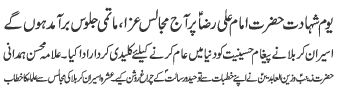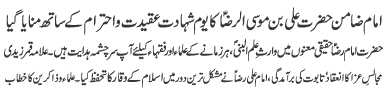 ISLAMABAD, October 5: The martyrdom anniversary of Imam Ali Ibne Mousa Al Raza (AS) will be commemorated with great religious zeal and reverence |