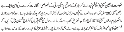 | ISLAMABAD, October 6: The government should ensure special security arrangements during Arabaeen e Hussain (Chehlum Shuhadae Karbala) - TNFJ | |||