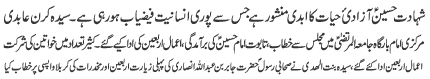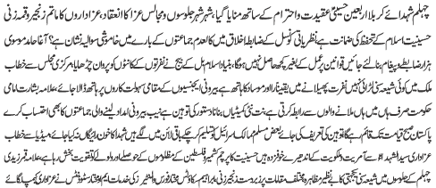 ISLAMABAD, October 9: The Chehlum (Arbaeen-e-Hussaini) of Shaheed-e-Azam and Mohsin-e-Insaniyyat Hazrat Imam Hussain (A.S.) and his 72 diehard companions was observed with traditional religious spirit, devotion and respect throughout the world |