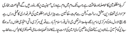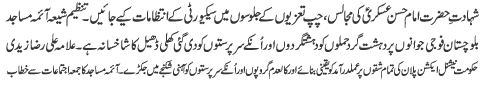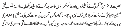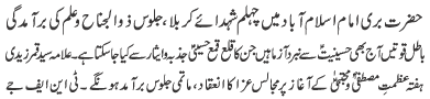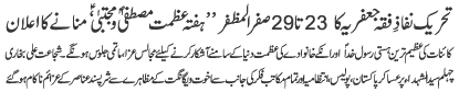 | ISLAMABAD, October 10: Tehreek Nafaz e Fiqh e Jafariya announced the observation of the "Hafta e Azmate Mustafa O Mujtaba (AS)" from 23- 29 Safar Al Muzafar | |||
