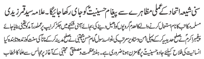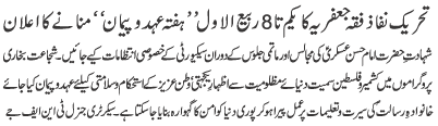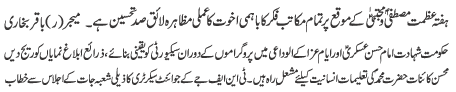 | ISLAMABAD, October 18: Tehreek Nafaz e Fiqh e Jafariya announced the observation of the "Hafta e Ehad O Peyman" from 1-8 Rabiul Awwal | |||