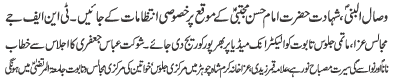 ISLAMABAD, October 15: Special arrangements must be ensured on the Wasaal Un Nabi SAWW and the martyrdom anniversary of Imam Hassan (AS) - TNFJ |