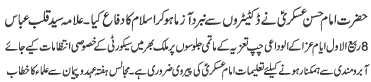 RAWALPINDI, October 22: Hazrat Imam Hassan Askari (AS) defended Islam by taking stand against dictators of his era - Allama Qalb e Abbas |
