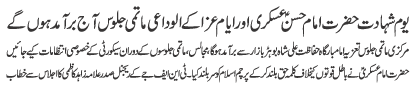 | ISLAMABAD, October 24: Today the main procession of the Shahadat of Imam Hassan Al Askari (AS) will be brought out from Jamia Tal Murtaza | |||