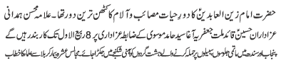 RAWALPINDI, August 31: The era of Imam Zainal Abideen (AS) was full of difficulties and hardships - Allama Mohsin Humdani |