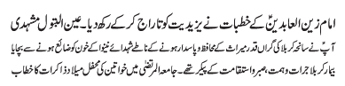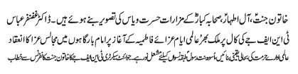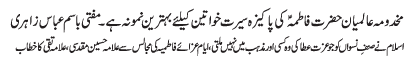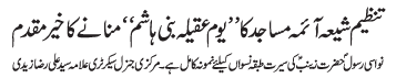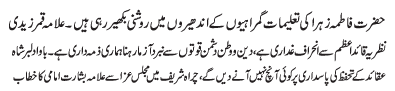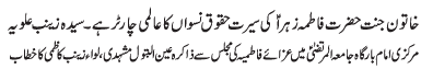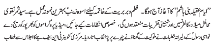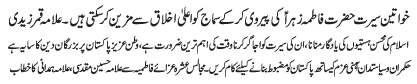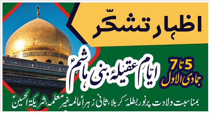 ISLAMABAD, December 10: Ayyame Aqeela e Bani Hashim (SA) will begin today; in order to defeat oppression and barbarity, the pious life of Hazrat Zainab (SA) is the best example to follow - Samar Naqvi |