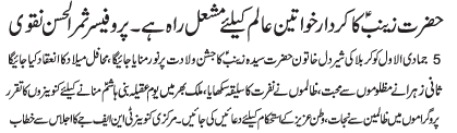 | ISLAMABAD, December 7: The pious character of Hazrat Zainab (SA) is the beacon of light for women folk - Prof Sammar Naqvi | ||