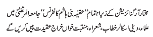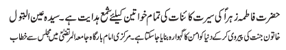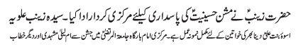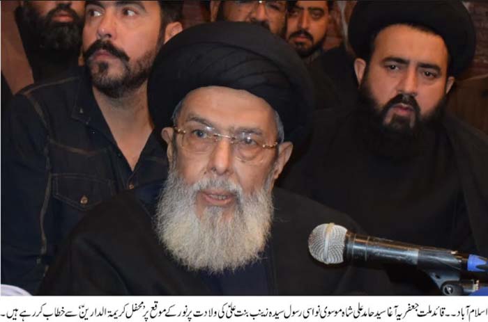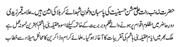 ISLAMABAD, December 11: Hazrat Zainab (SA) Binte Ali (SA) is the savior of mission of Hussainiat and trustee of the blood of the martyrs of Karbala - Qamar Zaidi |
