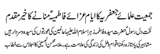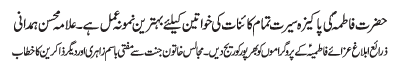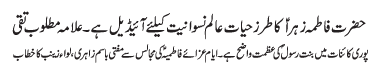 | RAWALPINDI, December 26: The pious life of Hazrat Fatima Zahra (SA) is the best example for woman folks - Basim Zahiri | ||