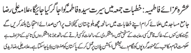 ISLAMABAD, January 8: "Ashrae Azae Fatimiya" The pious life of Syeda Fatima Zahra(SA) will be highlighted in the Friday sermons - Allama Ali Raza |