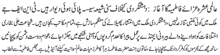 | ISLAMABAD, January 9: Aalmi Ashrae Azae Fatimiya begins; Sunni and Shia are united against terrorism - TNFJ | |||