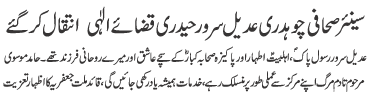 RAWALPINDI, 21 January 22: Senior journalist Chaudhary Adeel Sarwar Haideri laid to rest; he was true followers of Ahlebait (AS) and Pakeeza Sahaba Kabaar (RA); always be remembered for his services for Islam and Pakistan - Hamid Moosavi |