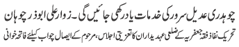 ISLAMABAD, January 16: Mohsin Naqvi Shaheed was the voice of democracy and messenger of peace, his delivery of Hussaini message will keep him alive eternally - Mazhar Shah Advocate |