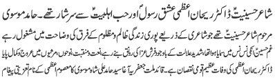ISLAMABAD, January 27: Poet of Hussainiat Dr Rehaan Uzmi was a real followers of the Holy Prophet and His Holy Progeny (AS) _ Hamid Moosavi |