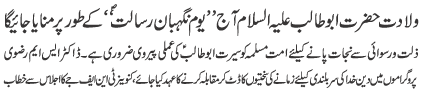 RAWALPINDI, June 10: Waladat e Purnoor of Hazrat Abu Talib (AS) will be celebrated as the "Youme Nigebaan e Risalat" |