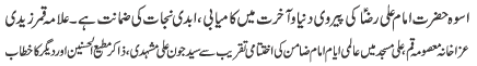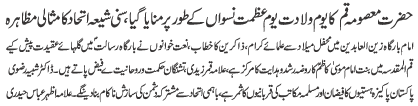 | ISLAMABAD, June 14: Youme Waladat e Purnoor of Hazrat Fatima Masooma e Qum (SA) was celebrated as Youme Azmate Niswaan; the unity amongst Sunni and Shia displayed | |||