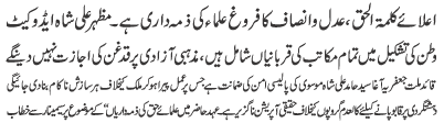 | ISLAMABAD, June 5: Mukhtar Organisation (MO) organized demonstrations throughout the country on the occasion of the International Ashra Sadiq Aal-e-Muhammad (A.S.) | |||