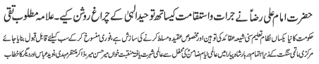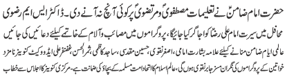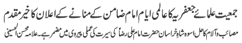 ISLAMABAD, June 30: TNFJ announced the observation of the "Ayyam e Aza" from 21-23 Zeeqad to commemorate the martyrdom of Imam Ali Raza (AS) |