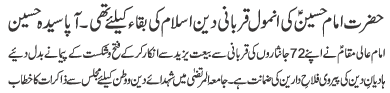 | ISLAMABAD, June 25: Sacrifice of Imam Hussain was for the eternal life of Islam - Aapa Syeda Hussain | |||