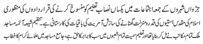 | ISLAMABAD, June 21: Aalmi Ayyame Zamin (AS); support of the stance of the TNFJ against the Unified syllabus of Islamic studies | |||