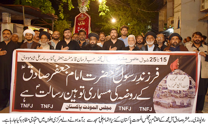 RAWALPINDI, June 30: On the call of the TNFJ, Protests will be held on Friday 2 July against the insult caused to Hazrat Imam Musa Kazim (AS) and the pious companions of the Holy Prophet (SAWW) |