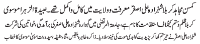 | ISLAMABAD, August 6: Hazrat Ali Akbar (AS) was on the highest pedestal of human qualities - Syeda Zahra Moosavi | ||