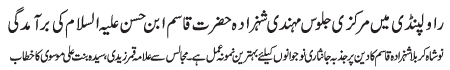 | RAWALPINDI, September 11: The pious life of Hazrat Imam Hussain (AS) is the source of guidance for the whole of humanity - Qamar Zaidi | ||