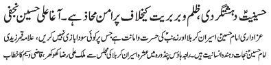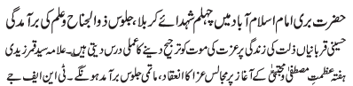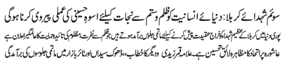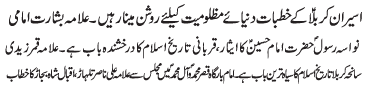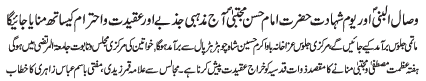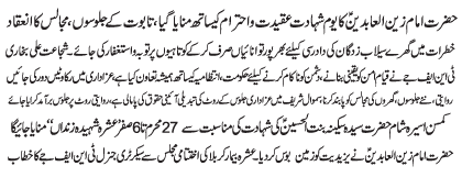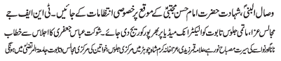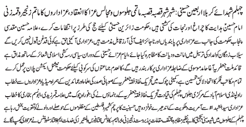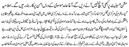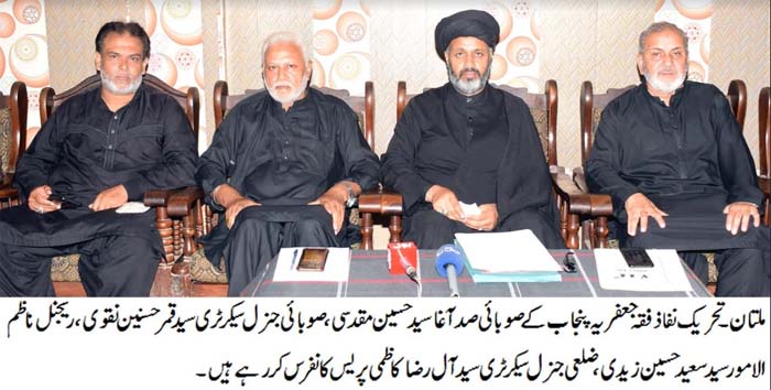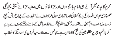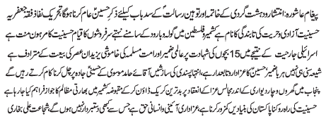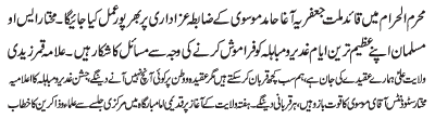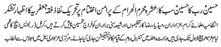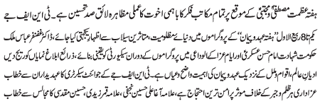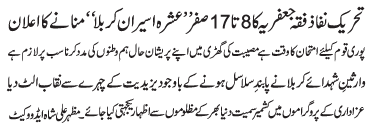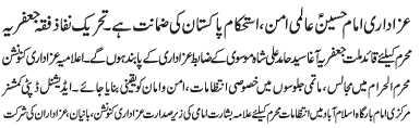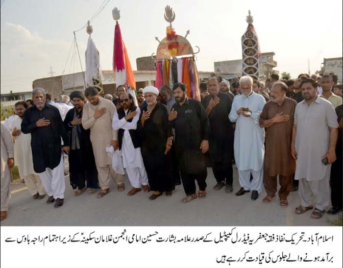 ISLAMABAD, September 5: Tehreek Nafaz e Fiqh e Jafariya announced the observation of the "Ashrae Aseeran e Karbala" from 8 to 17 Safar Al Muzafar |