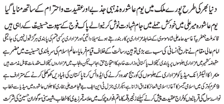 RAWALPINDI, August 11: Youm e Ashura was observed with respect and religious zeal throughout the country including Kashmir and Gilgit Baltistan |