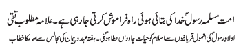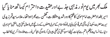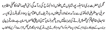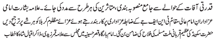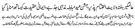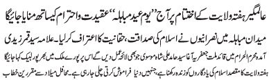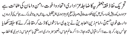 ISLAMABAD, September 27: The Tehreek Nafaz e Fiqh e Jafariya announced the observation of the "Hafta e Ehad O Peyman" from 1-8 Rabiul Awwal |