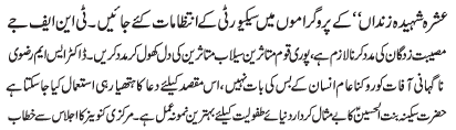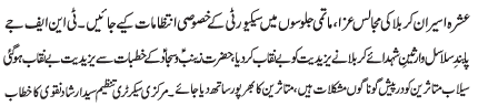 ISLAMABAD, September 9: Special security arrangments should be made in the Majalis and Matami processions of Ashrae Aseerane Karbala - TNFJ |