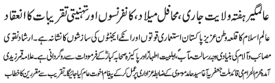 RAWALPINDI, July 23: Aalmgheer Hafta e Walayat continued; throughout the country programs of milaad, mahafil and festive gatherings were held |