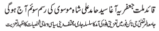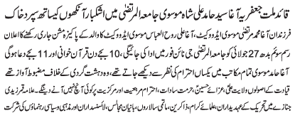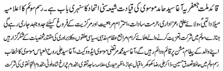 ISLAMABAD, July 27: Rasam e Soyam of the Quaid e Millat e Jafariya Agha Syed Hamid Ali Shah Moosavi will be held today at Jamia Al Murtaza Islamabad |