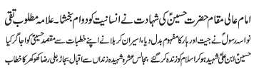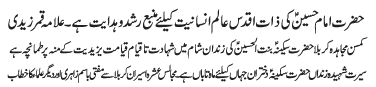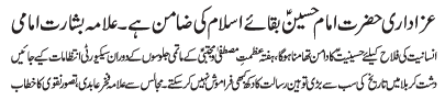 | RAWALPINDI, September 2: The martyrdom of Imam Hussain gave eternal life to humanity - Allama Matloob Taqi | ||