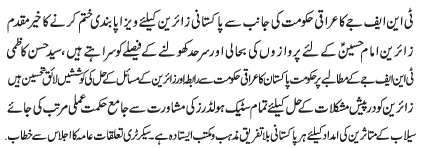 ISLAMABAD, September 12: TNFJ Welcomes the decision of Iraqi Government to lift the ban of Visa for Pakistani pilgrims is commendable |