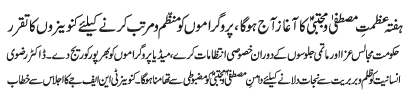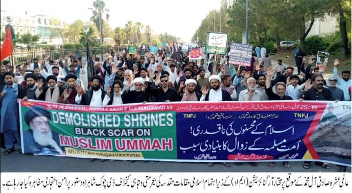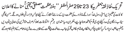 ISLAMABAD, September 19: The Tehreek Nafaz e Fiqh e Jafariya announced the observation of the "Hafta e Azmat e Mustafa Wa Mujtaba (AS)) from 23-29 Saffar Al Muzaffar |