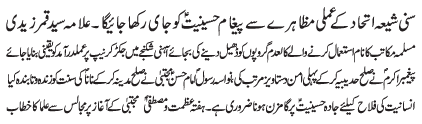 RAWALPINDI, September 21: The message of Hussainiat should be carried on by the display of unity amongst Sunni and Shia - Qamar Zaidi |