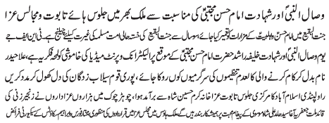 RAWALPINDI, September 25: Wasal un Nabi (SAWW) and the Shahadat of Imam Hassan Mujtaba (AS) will be commemorated today with great religious zeal and reverence |
